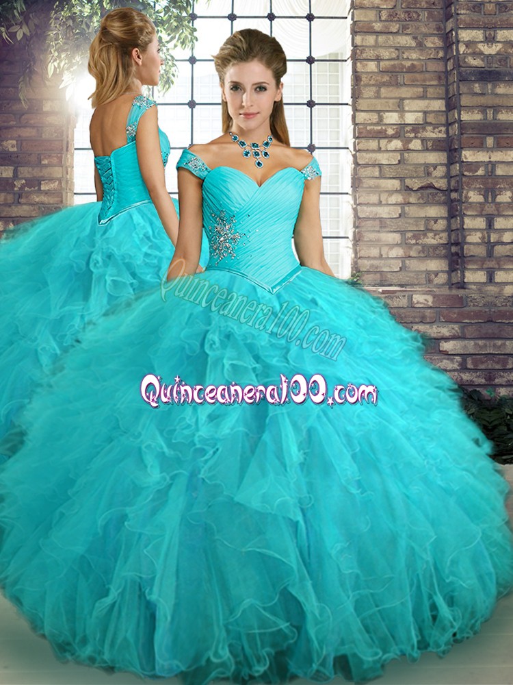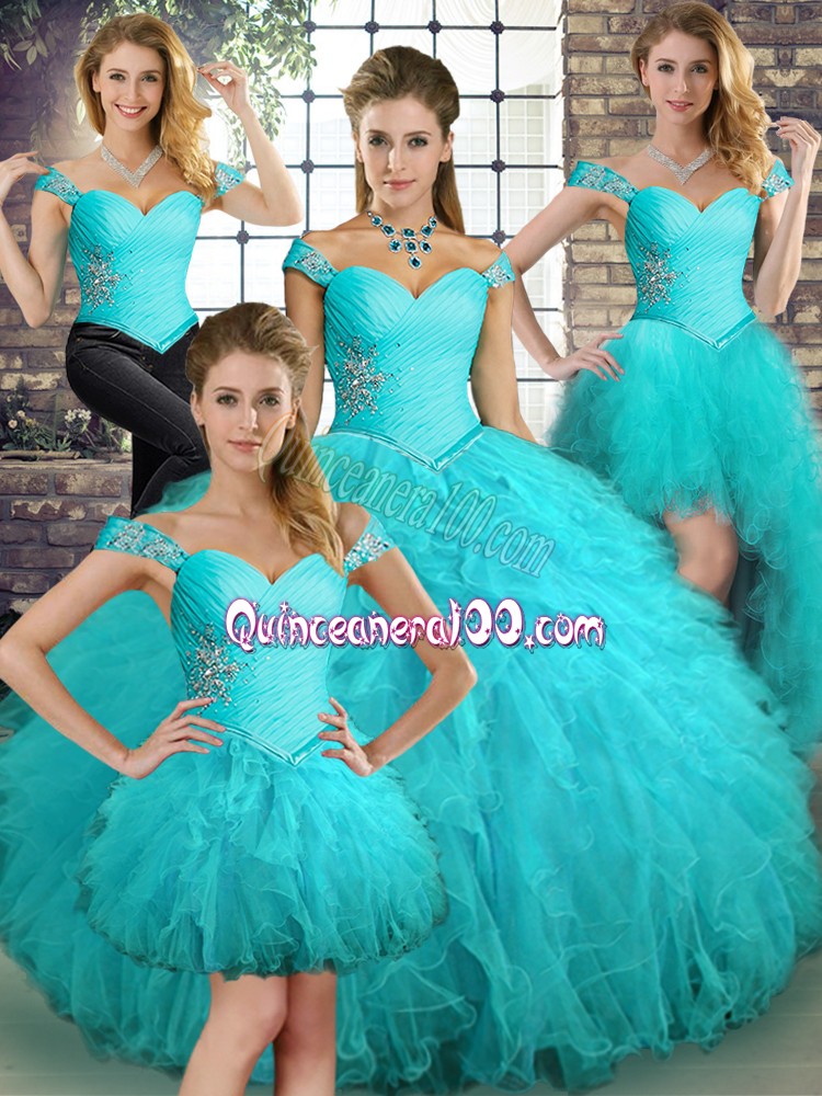 Neckline : Off the shoulder Shown Color : Aqua Blue Silhouette : Ball Gowns Sleeve Length : sleeveless Hemline : floor length Back Detail : Lace up Fabric : Tulle Embellishment : Beading,Ruffles Occasion : Military Ball,Sweet 16,Quinceanera Season : Spring,Summer,Fall,Winter