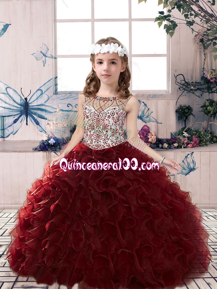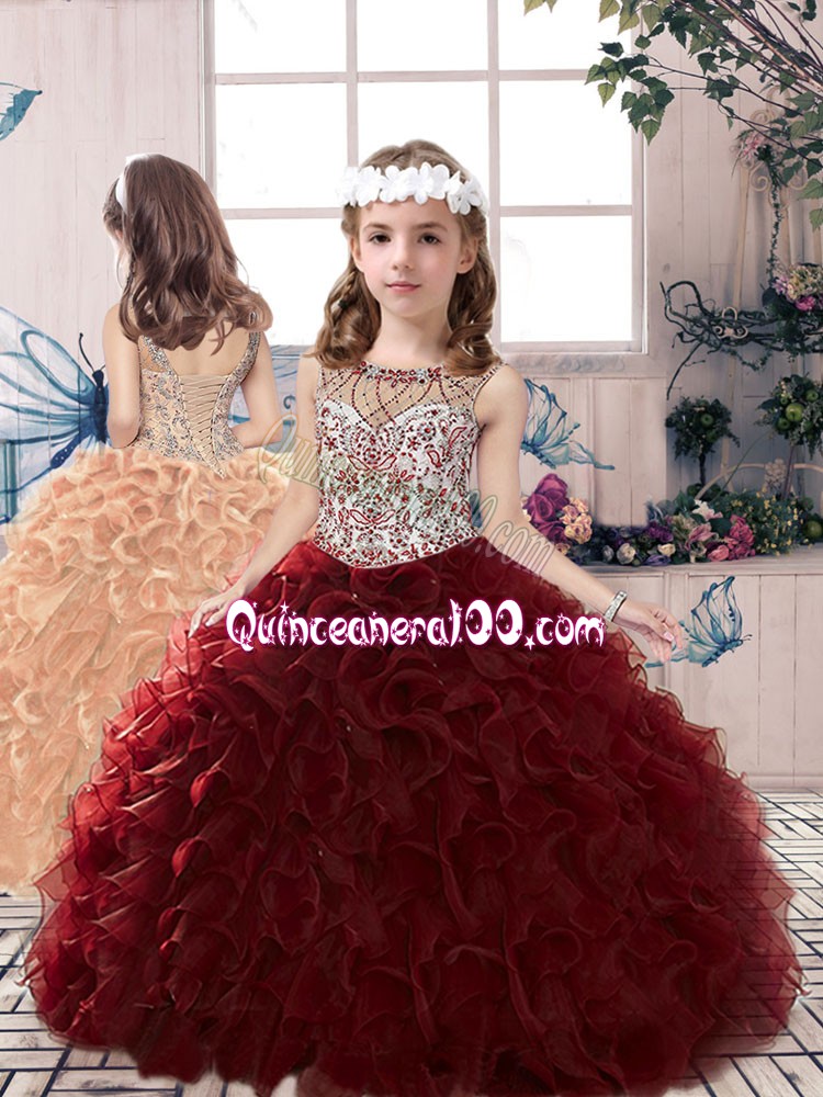 Neckline : ScoopShown Color : BurgundySilhouette : Ball GownsSleeve Length : sleevelessHemline : floor lengthBack Detail : Lace upFabric : OrganzaEmbellishment : Beading,RufflesOccasion : Party,Wedding PartySeason : Spring,Summer,Fall,Winter