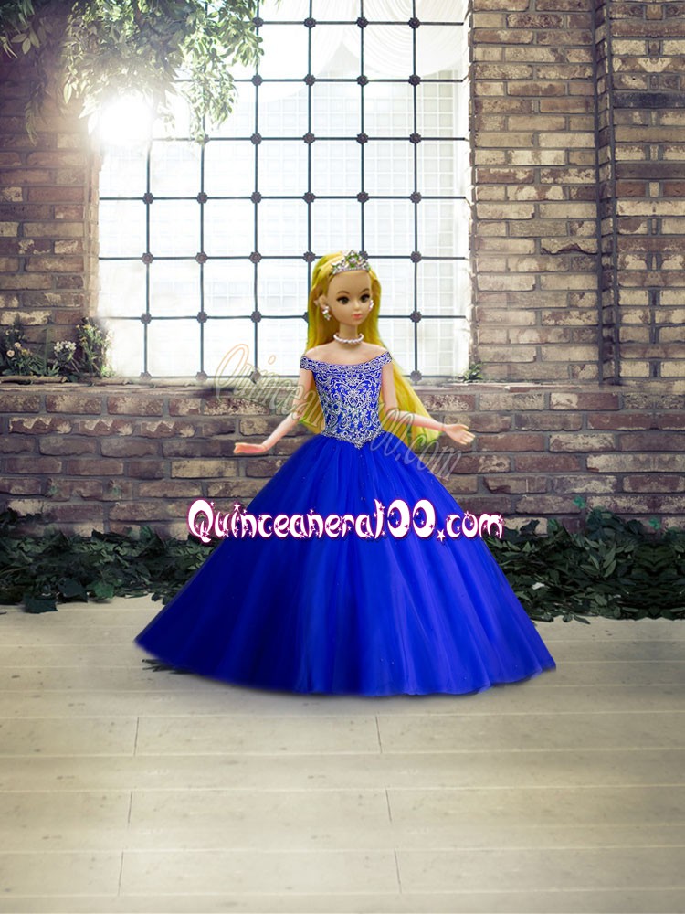 Hot Sale Royal Blue Tulle Lace Up Off The Shoulder Sleeveless Sweet 16 Quinceanera Dress Brush Train Beading