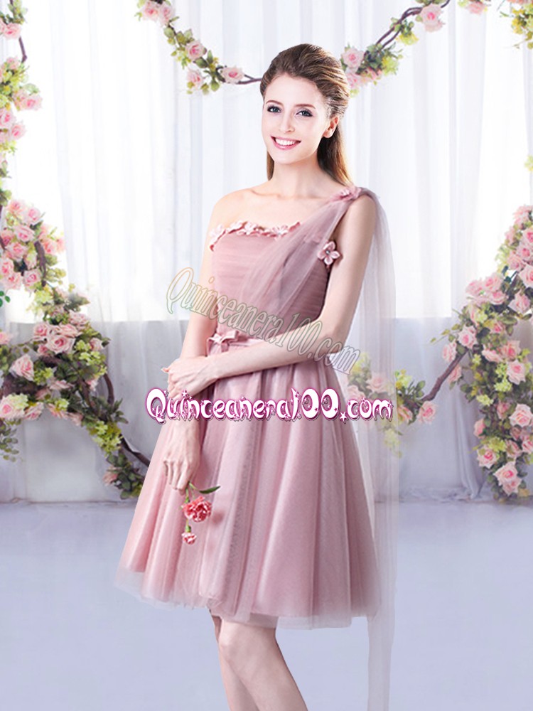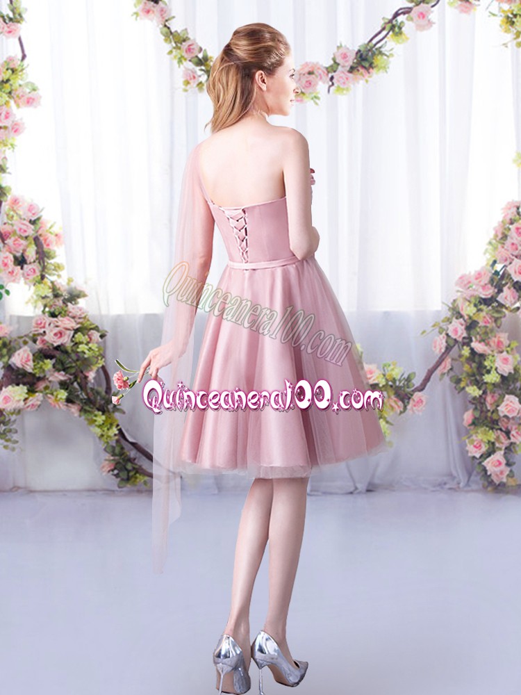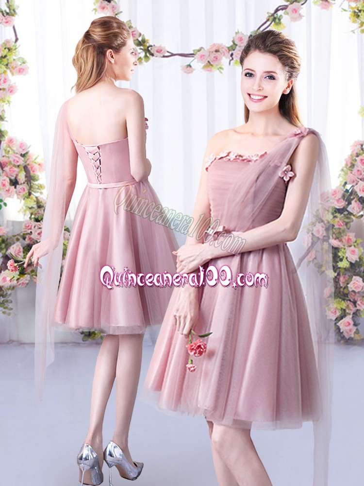 Neckline : One shoulderShown Color : Pink Silhouette : A-lineSleeve Length : sleevelessHemline : knee lengthBack Detail : Lace upFabric : TulleEmbellishment : Appliques,BeltOccasion : Wedding PartySeason : Spring,Summer,Fall
