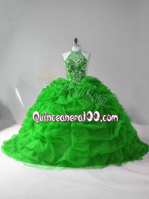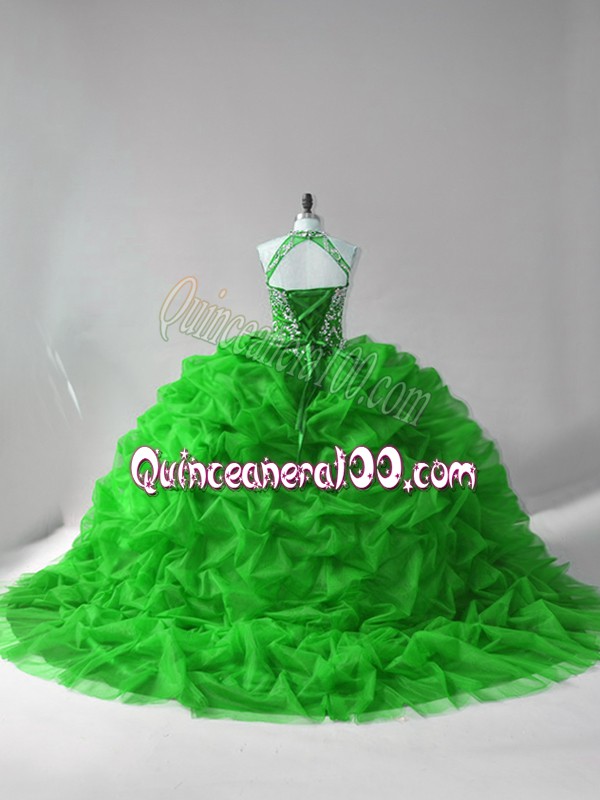 Neckline : Halter topShown Color : GreenSilhouette : Ball GownsSleeve Length : sleevelessBack Detail : Lace upFabric : OrganzaEmbellishment : Beading,Pick UpsOccasion : Sweet 16,QuinceaneraSeason : Spring,Summer,Fall,Winter