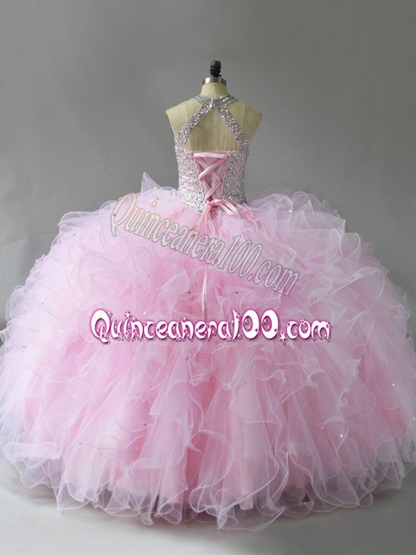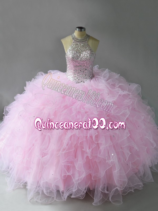 Neckline : Halter topShown Color : Pink Silhouette : Ball GownsSleeve Length : sleevelessHemline : floor lengthBack Detail : Lace upFabric : TulleEmbellishment : Beading,RufflesOccasion : Military Ball,Sweet 16,QuinceaneraSeason : Spring,Summer,Fall,Winter