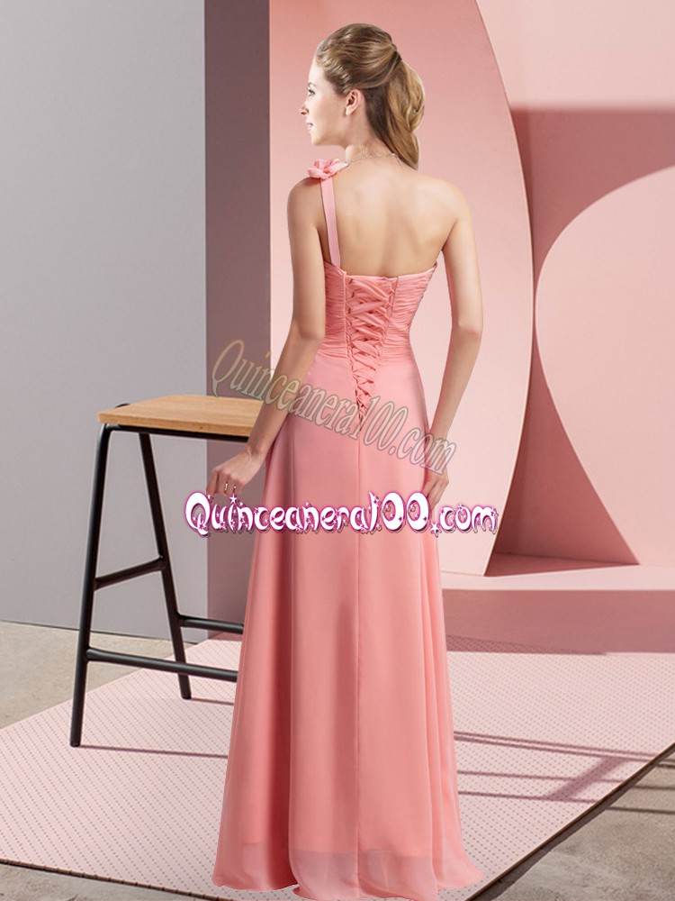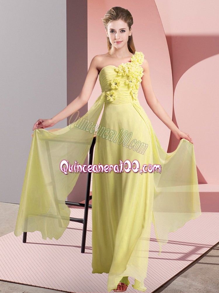 Neckline : One shoulder Shown Color : Yellow Silhouette : Empire Sleeve Length : sleeveless Hemline : floor length Back Detail : Lace up Fabric : Chiffon Embellishment : Hand Made Flower Occasion : Wedding Party Season : Spring,Summer,Fall,Winter
