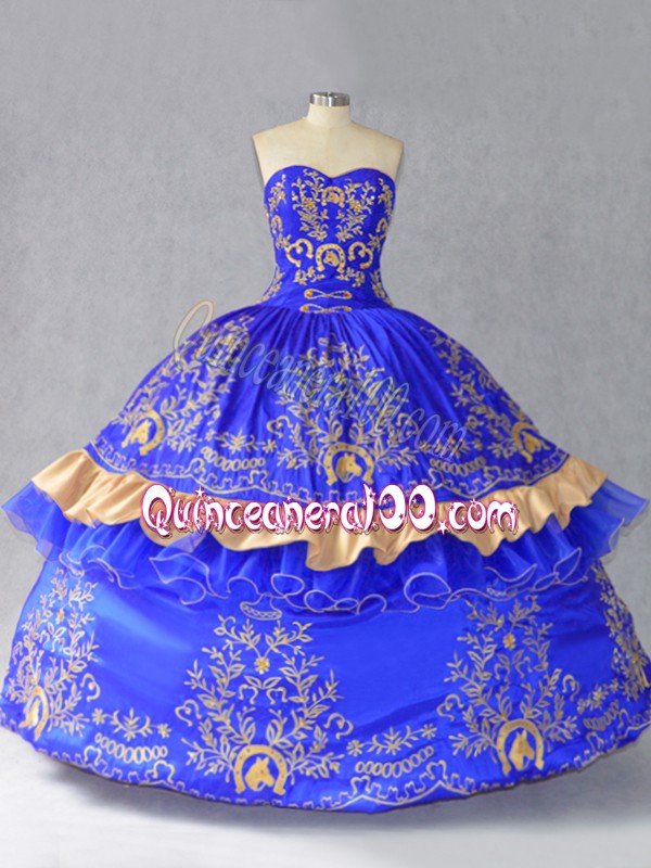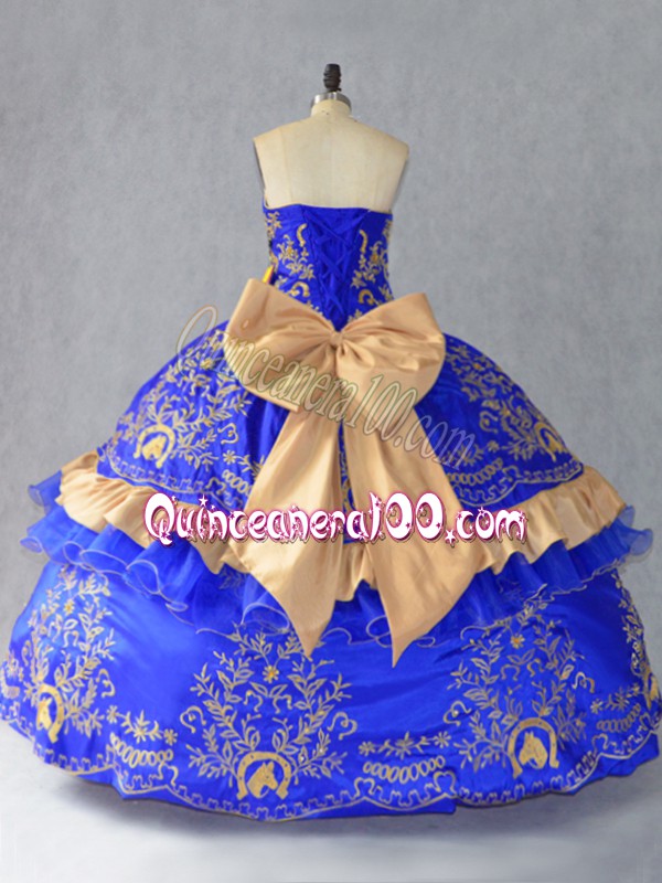 Neckline : SweetheartShown Color : Royal BlueSilhouette : Ball GownsSleeve Length : sleevelessHemline : floor lengthBack Detail : Lace upFabric : Satin,OrganzaEmbellishment : Embroidery,BowknotOccasion : Sweet 16,QuinceaneraSeason : Spring,Summer,Fall,Winter