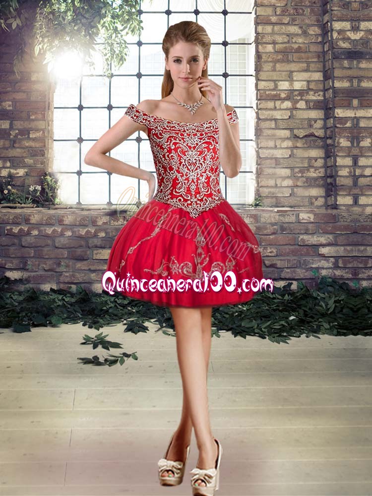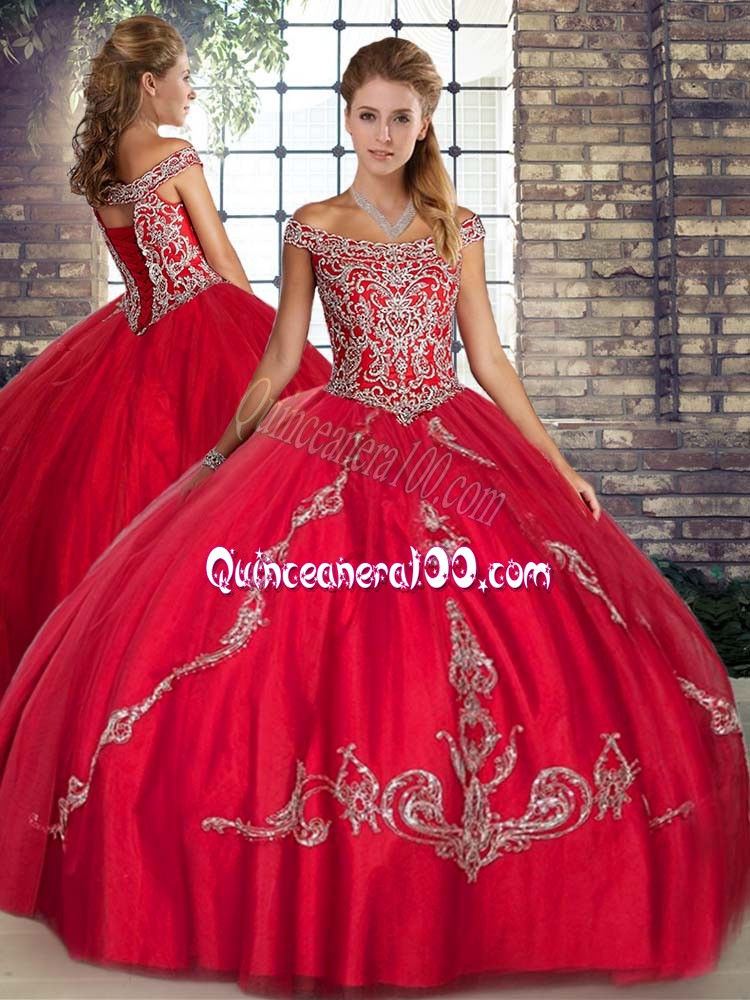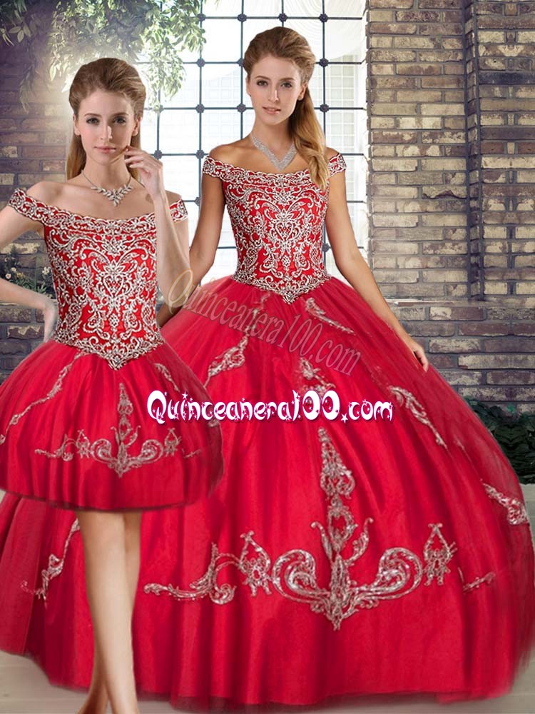 Neckline : Off the shoulder Shown Color : Red Silhouette : Three Pieces Sleeve Length : sleeveless Hemline : floor length Back Detail : Lace up Fabric : Tulle Embellishment : Beading,Embroidery Occasion : Military Ball,Sweet 16,Quinceanera Season : Spring,Summer,Fall,Winter