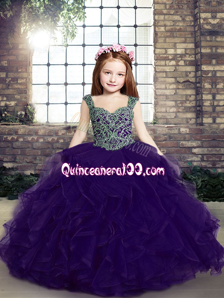 Neckline : StrapsShown Color : PurpleSilhouette : Ball GownsSleeve Length : sleevelessHemline : floor lengthBack Detail : Lace upFabric : TulleEmbellishment : Beading,RufflesOccasion : Party,Military Ball,Wedding PartySeason : Spring,Summer,Fall,Winter