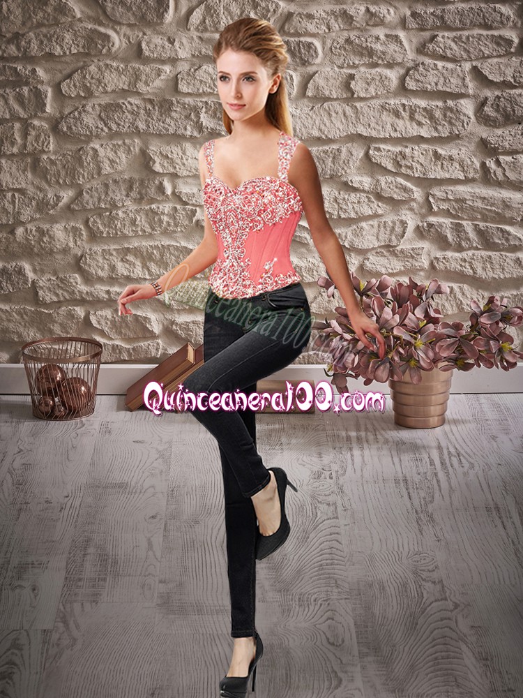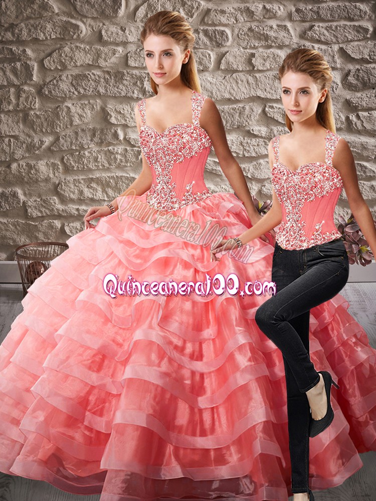 Neckline : StrapsShown Color : Watermelon RedSilhouette : Ball GownsSleeve Length : sleevelessBack Detail : Lace upFabric : OrganzaEmbellishment : Beading,Ruffled LayersOccasion : Sweet 16,QuinceaneraSeason : Spring,Summer,Fall,Winter