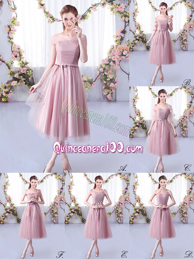 Neckline : Off the shoulder Shown Color : Pink Silhouette : Empire Sleeve Length : sleeveless Hemline : tea length Back Detail : Lace up Fabric : Tulle Embellishment : Belt Occasion : Wedding Party Season : Spring,Summer,Fall,Winter