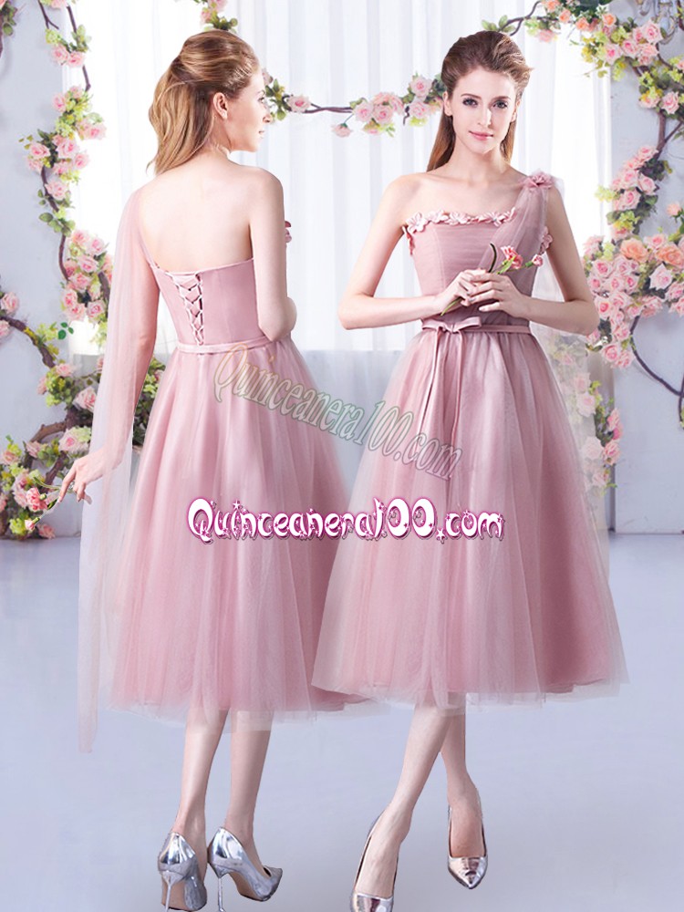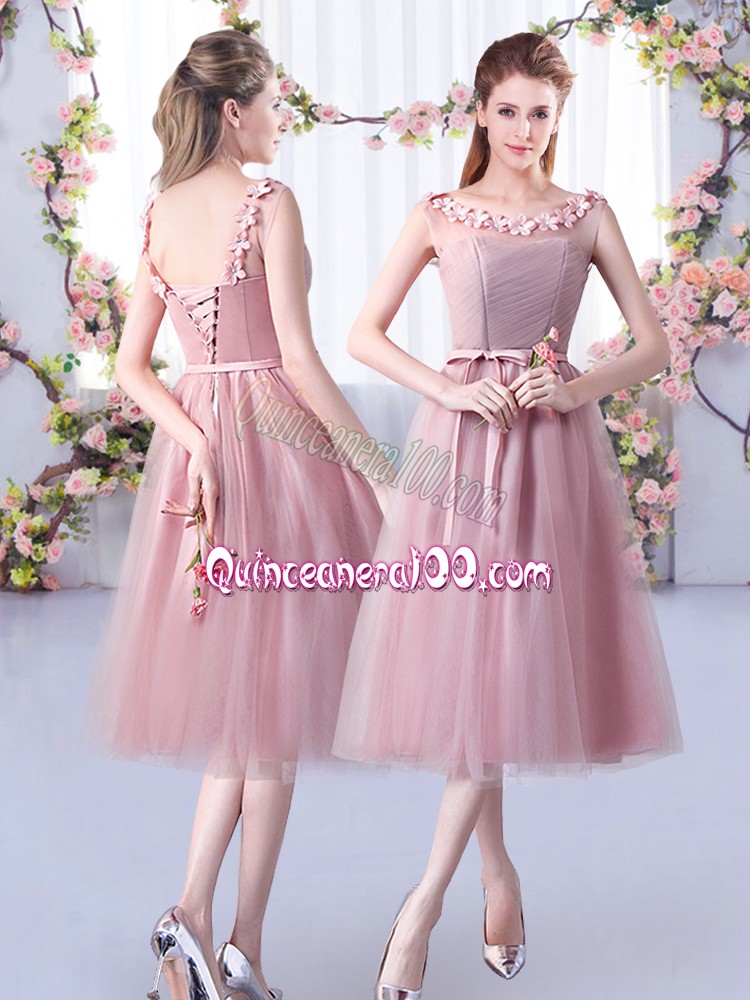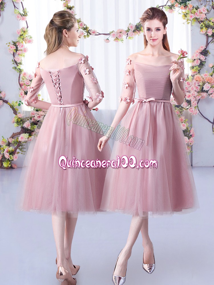 Fantastic Tea Length Pink Damas Dress Off The Shoulder Sleeveless Lace Up