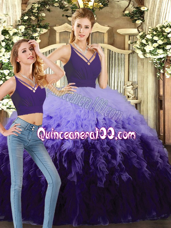 Neckline : V-neckShown Color : Purple,Multi-colorSilhouette : Ball GownsSleeve Length : sleevelessHemline : floor lengthBack Detail : BacklessFabric : TulleEmbellishment : Beading,RufflesOccasion : Sweet 16,QuinceaneraSeason : Spring,Summer,Fall,Winter