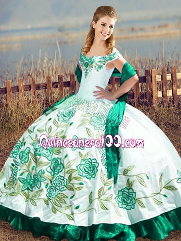 Neckline : Off the shoulderShown Color : GreenSilhouette : Ball GownsSleeve Length : sleevelessHemline : floor lengthBack Detail : Lace upFabric : Satin,OrganzaEmbellishment : Embroidery,RufflesOccasion : Sweet 16,QuinceaneraSeason : Spring,Summer,Fall,Winter