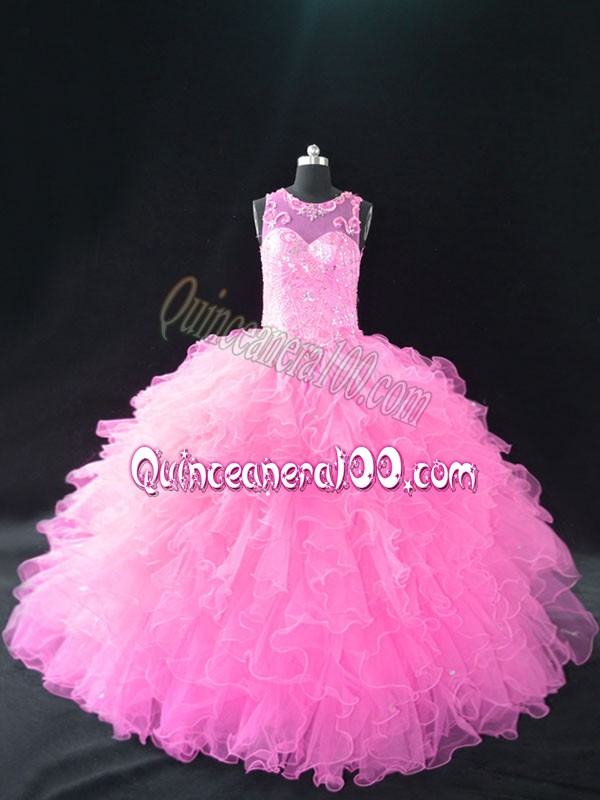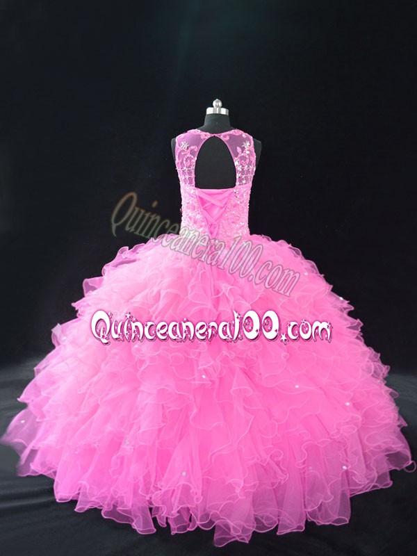 Neckline : ScoopShown Color : Baby PinkSilhouette : Ball GownsSleeve Length : sleevelessBack Detail : Lace upFabric : OrganzaEmbellishment : Beading,RufflesOccasion : Sweet 16,QuinceaneraSeason : Spring,Summer,Fall,Winter