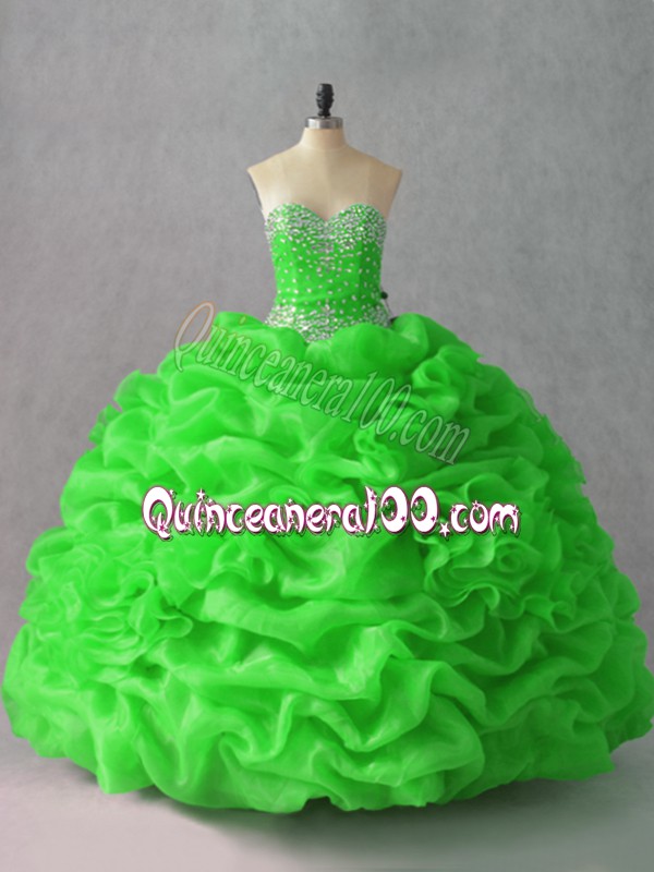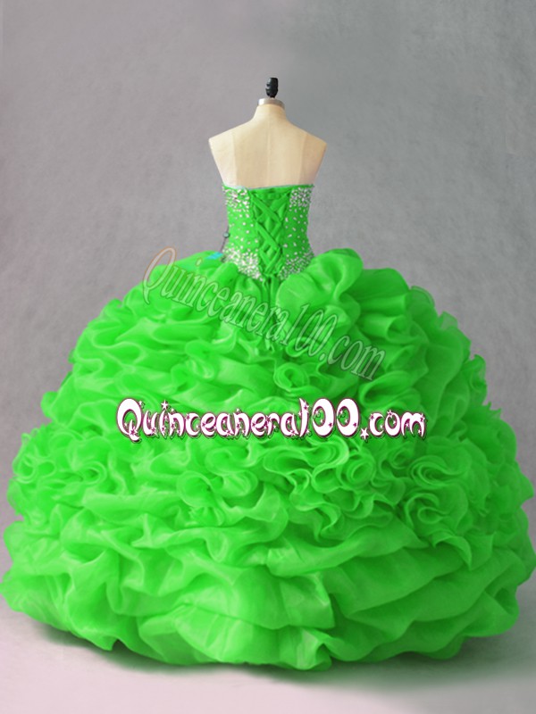 Neckline : SweetheartShown Color : Green,Spring GreenSilhouette : Ball GownsSleeve Length : sleevelessHemline : floor lengthBack Detail : Lace upFabric : OrganzaEmbellishment : Beading,Hand Made FlowerOccasion : Sweet 16,QuinceaneraSeason : Spring,Summer,Fall,Winter