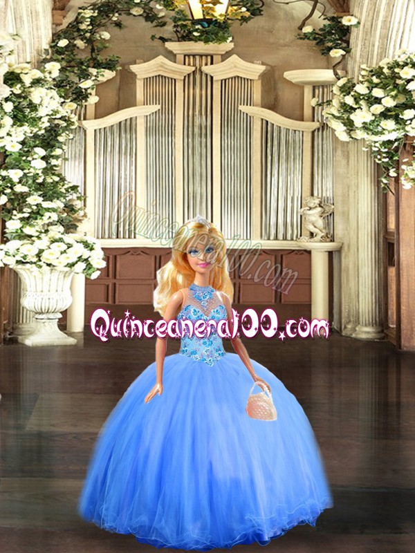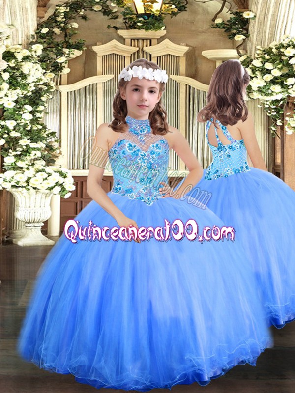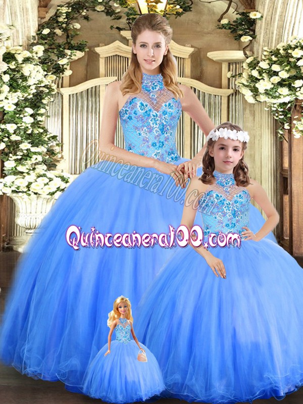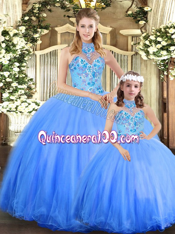 Neckline : Halter topShown Color : BlueSilhouette : Ball GownsSleeve Length : sleevelessHemline : floor lengthBack Detail : Lace upFabric : TulleEmbellishment : EmbroideryOccasion : Sweet 16,QuinceaneraSeason : Spring,Summer,Fall,Winter
