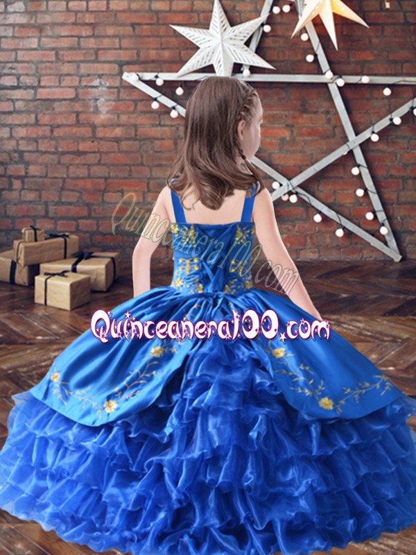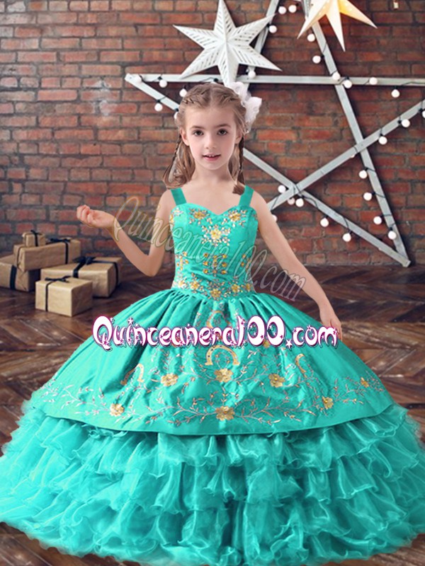 Neckline : StrapsShown Color : TurquoiseSilhouette : Ball GownsSleeve Length : sleevelessHemline : floor lengthBack Detail : Lace upFabric : Satin,OrganzaEmbellishment : Embroidery,Ruffled LayersOccasion : Wedding PartySeason : Spring,Summer,Fall,Winter