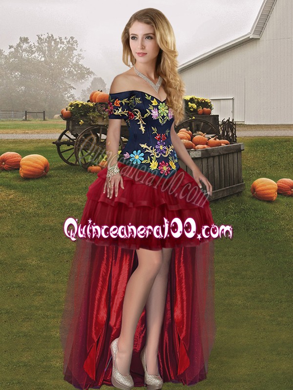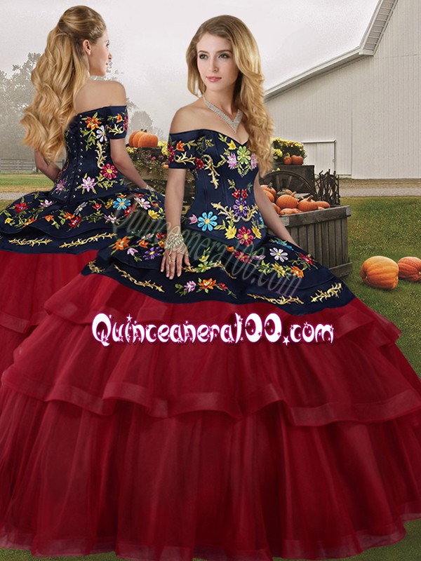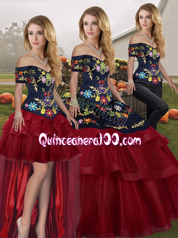 Neckline : Off the shoulder Shown Color : Wine Red Silhouette : Three Pieces Sleeve Length : sleeveless Back Detail : Lace up Fabric : Tulle Embellishment : Embroidery,Ruffled Layers Occasion : Military Ball,Sweet 16,Quinceanera Season : Spring,Summer,Fall,Winter