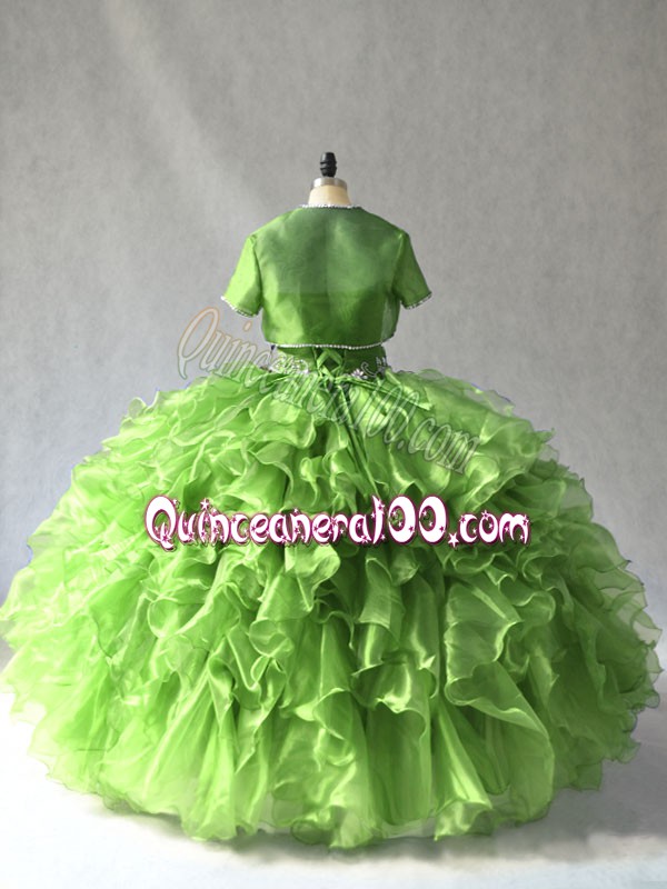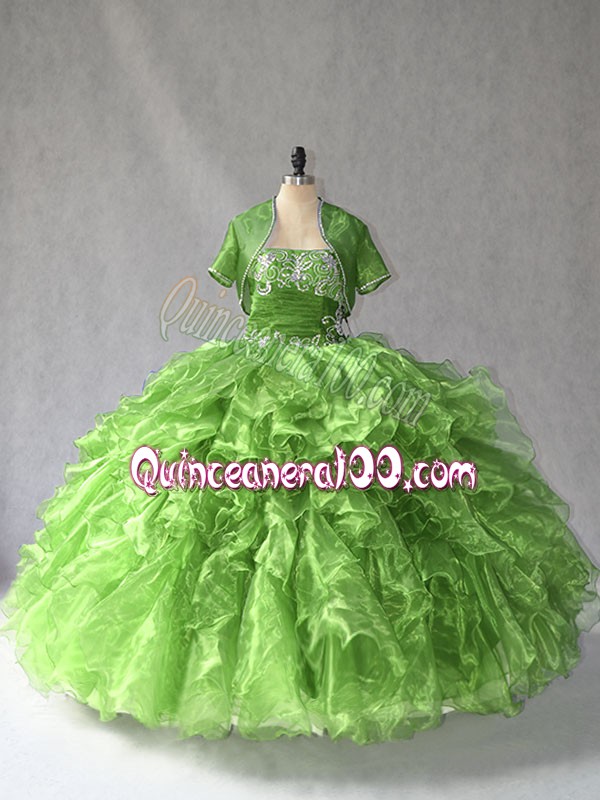 Neckline : StraplessShown Color : GreenSilhouette : Ball GownsSleeve Length : sleevelessHemline : floor lengthBack Detail : Lace upFabric : OrganzaEmbellishment : Beading,RufflesOccasion : Sweet 16,QuinceaneraSeason : Spring,Summer,Fall,Winter