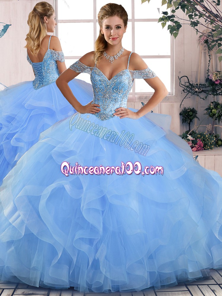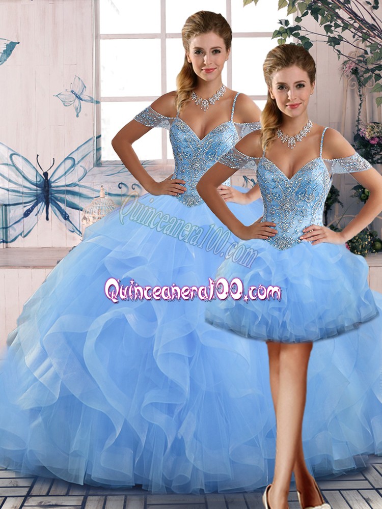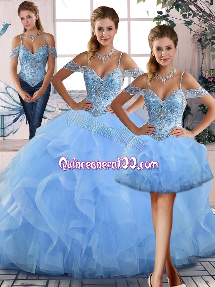 Neckline : Off the shoulder Shown Color : Blue Silhouette : Three Pieces Sleeve Length : sleeveless Hemline : floor length Back Detail : Lace up Fabric : Tulle Embellishment : Beading,Ruffles Occasion : Sweet 16,Quinceanera Season : Spring,Summer,Fall,Winter