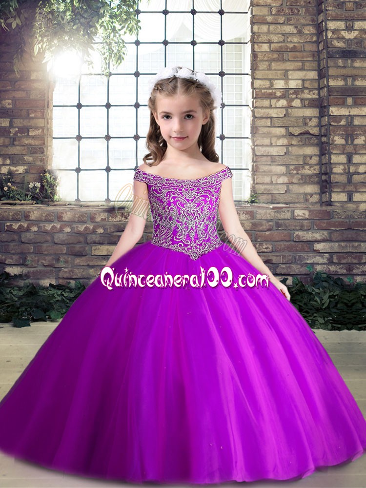 Neckline : Off the shoulderShown Color : PurpleSilhouette : Ball GownsSleeve Length : sleevelessHemline : floor lengthBack Detail : Lace upFabric : TulleEmbellishment : BeadingOccasion : Party,Military Ball,Wedding PartySeason : Spring,Summer,Fall,Winter