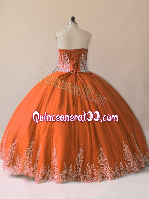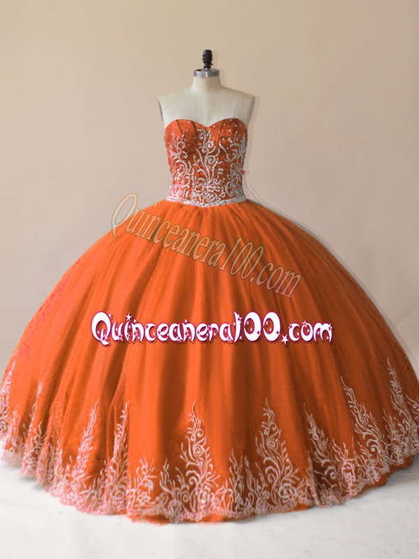 Neckline : SweetheartShown Color : OrangeSilhouette : Ball GownsSleeve Length : sleevelessHemline : floor lengthBack Detail : Lace upFabric : TulleEmbellishment : EmbroideryOccasion : Sweet 16,QuinceaneraSeason : Spring,Summer,Fall,Winter