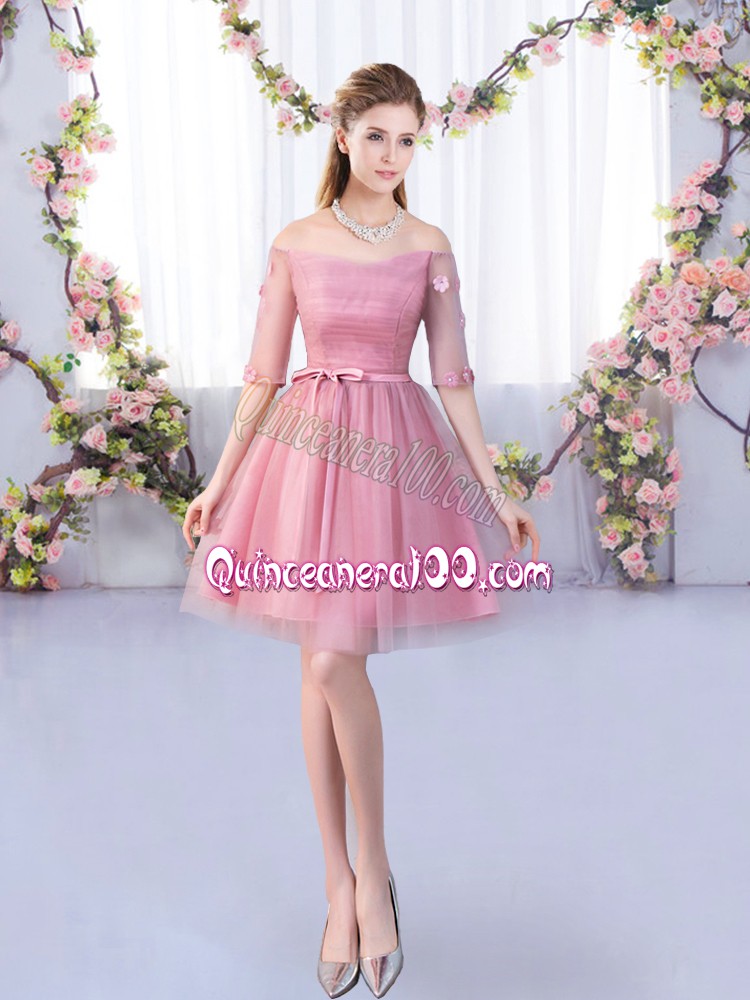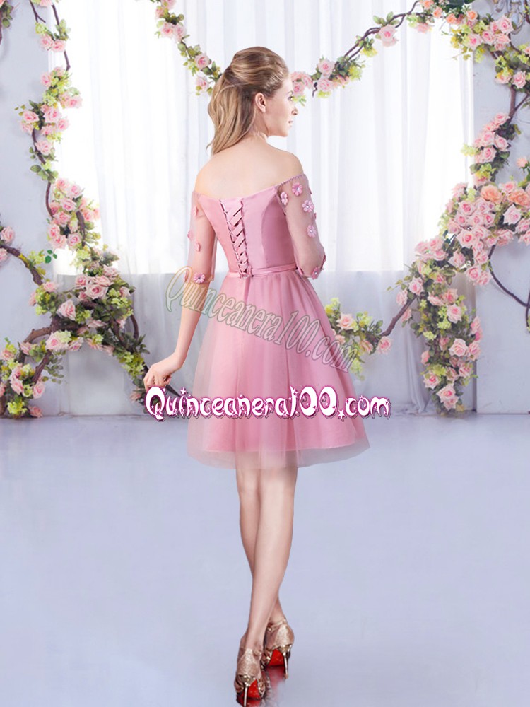 Discount Pink Tulle Lace Up Off The Shoulder Half Sleeves Mini Length Dama Dress Lace and Belt