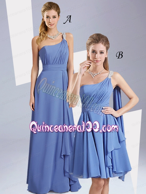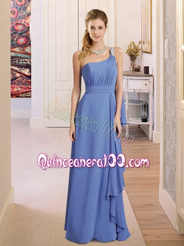 Neckline : One shoulderShown Color : BlueSleeve Length : sleevelessHemline : floor lengthFabric : ChiffonEmbellishment : Beading,RuchingOccasion : Prom,Quinceanera,Wedding PartySeason : Spring,Summer,Fall