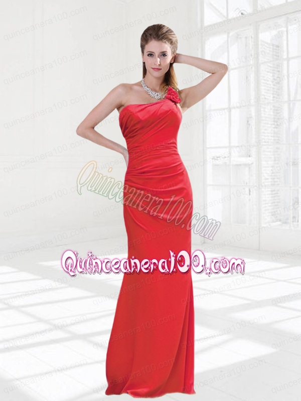 Neckline : One shoulderShown Color : RedSilhouette : Column/SheathSleeve Length : sleevelessHemline : floor lengthBack Detail : ZipperFabric : ChiffonEmbellishment : Ruching,Hand Made FlowerOccasion : Prom,Party,Wedding PartySeason : Spring,Summer,Fall,Winter